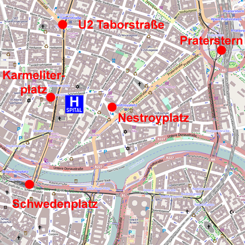 • Linie U2 bis Taborstraße (Taborstraße Richtung 1. Bezirk und dann Schmelzgasse)