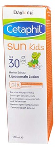 Cetaphil Sun Kids liposomale Lotion zieht schnell ein und pflegt die Kinderhaut mit Dexpanthenol und Glycerin; zusätzlich sind Vitamin E und Aloe Vera enthalten.