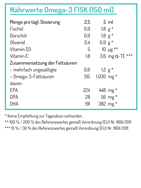 NORSAN Omega-3 FISK enthält eine einzigartige Kombination von natürlichen, hochdosierten, aber nicht-konzentrierten Fischölen aus Wildfang sowie einem kaltgepressten Olivenöl. Omega-3 FISK ist besonders für Kinder und Teenager, aber auch Erwachsene geeignet. Die empfohlene Tagesdosis (5 ml) beinhaltet 1,8 g Fischöl, 1,8 g Dorschöl und 0,9 g Olivenöl. Ein Dosierbecher ist in der Packung enthalten.