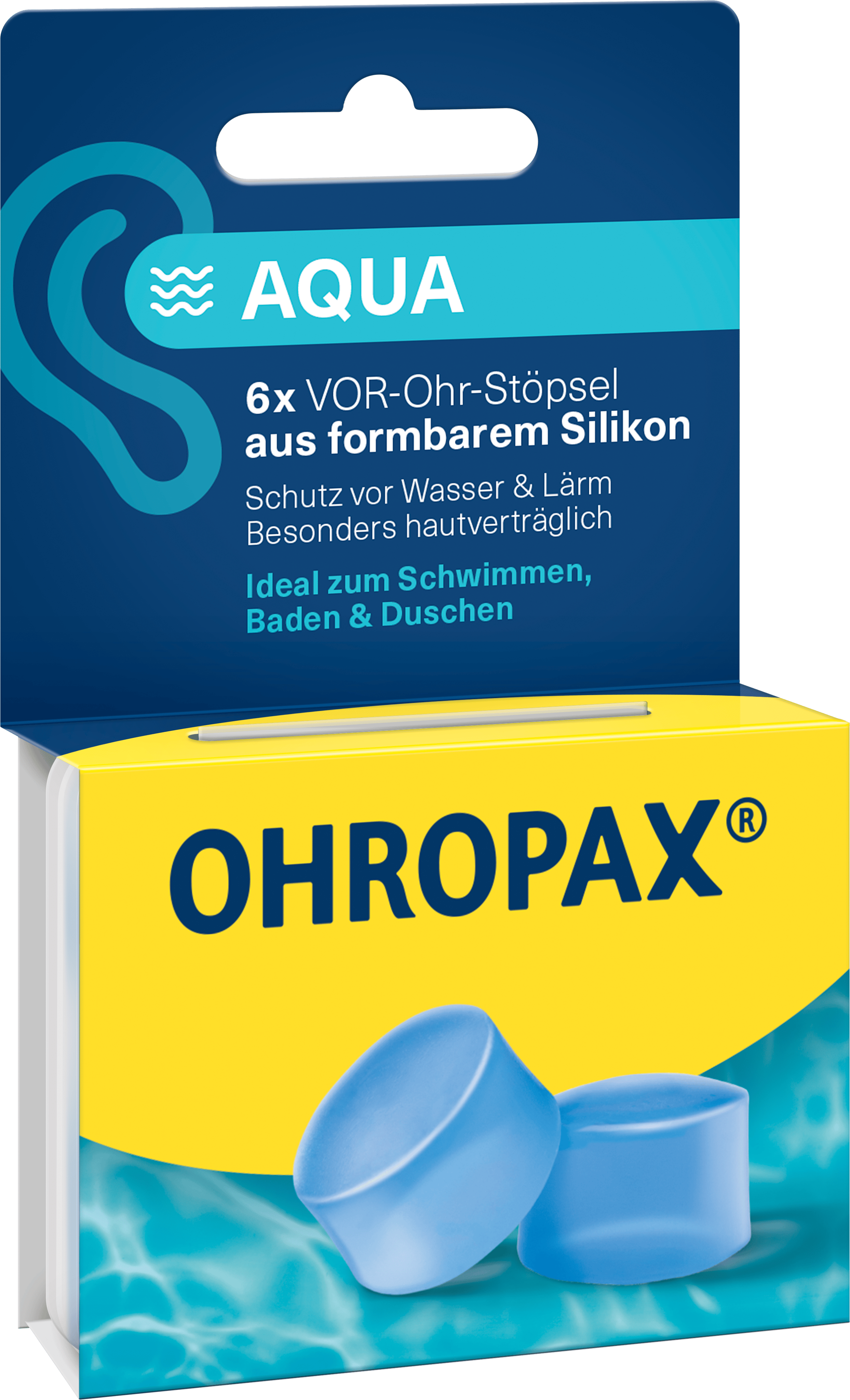 Ohropax Aqua Ohrstöpsel wurden speziell für den Einsatz im Wasser entwickelt. Sie bestehen aus weichem, wasserabweisendem Material und schützen den Gehörgang zuverlässig beim Schwimmen oder Duschen. Dank ihrer ergonomischen Form sitzen sie angenehm im Ohr und bieten sicheren Halt – ideal für Schwimmbad, Meer oder Wassersport.