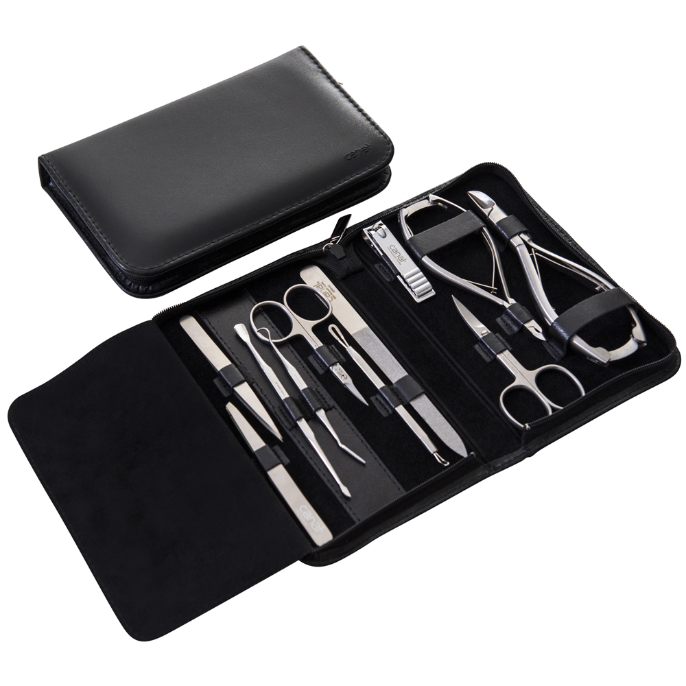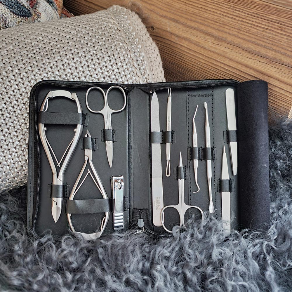 Im Set enthalten: Nagelschere, Hautschere, Haarpinzette schräg, Splitterpinzette, Nagelzange, Hautzange, Nagelknipser, Diamantfeile, Eckenfeile, Komedonenquetscher und Maniküreinstrument.
