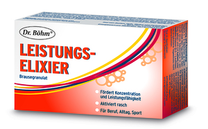 Hochwertige Vitalstoffe als schmackhafte BrauseFördert Konzentration und LeistungsfähigkeitAktiviert raschFür Beruf, Alltag, SportDas moderne Leben ist schnell, aktiv und abwechslungsreich. Jeden Tag fordert es von uns viel Energie und Kraft. Müdigkeit kann die Folge sein. Trotzdem leistungsfähig und wach zu bleiben - das wird in Beruf, Alltag und Sport einfach von uns erwartet. Wer den dauerhaften Erfolg sucht, braucht daher Möglichkeiten, täglich etwas Gutes für Körper und Geist zu tun. Diesem Prinzip folgend wurde Dr. Böhm® Leistungs-Elixier exklusiv für die Apotheke entwickelt.Für Körper und Geist In Dr. Böhm® Leistungs-Elixier steckt einfach mehr: Die breite Palette an ausgesuchten Inhaltsstoffen umfasst Koffein, Taurin, Arginin, Cholin, Ginseng-Extrakt, OPC aus Traubenkernen, Magnesium, B-Vitamine, Vitamin C, E und Zink. Stoffe wie das enthaltene Magnesium oder Vitamin B12 tragen zur Reduktion von Müdigkeit bei. Pantothensäure unterstützt zusätzlich die geistige Leistung. Ginseng fördert die Konzentration, Vitalität und geistige Wachheit. Doch nicht nur der Geist, auch der Körper profitiert: So tragen zum Beispiel Vitamin C und Zink zu einem gesunden Immunsystem bei. Der Energiestoffwechsel und die Muskelfunktion des Körpers werden unter anderem durch Magnesium unterstützt.Zusammensetzung Dr. Böhm® Leistungs-Elixier pro Säckchen: L-Argininaspartat 500 mg; Taurin 500 mg; Koffein 80 mg; Ginseng-Extrakt 50 mg; Traubenkern-Extrakt (OPC) 20 mg; Cholin 100 mg; Magnesium 150 mg; Zink 6 mg; Vitamin C 50 mg; Thiamin (Vitamin B1) 0,55 mg; Riboflavin (Vitamin B2) 0,35 mg; Vitamin B6 0,8 mg; Vitamin B12 1,5 μg; Folsäure 150 μg; Pantothensäure 2,5 mg; Niacin 7,5 mg; Vitamin E 5 mgDosierung und Anwendung Dr. Böhm® Leistungs-Elixier: Täglich 1 - 2 Säckchen je nach Bedarf über den Tag verteilt. Den Inhalt eines Säckchens in ein Glas geben und mit kaltem oder heißem Wasser (0,2-1 l) auflösen. Die empfohlene Tagesdosis nicht überschreiten. Frei von Zucker, Lactose, Hefe, Gluten und Farbstoffen.Für Vegetarier geeignet.Nahrungsergänzungsmittel mit Süßungsmitteln. Für Diabetiker geeignet. Hinweis: Enthält Koffein. Für Kinder und schwangere Frauen nicht empfohlen. Gebrauchsanwendung: Dr. Böhm® Leistungs-Elixier2590425Nebenwirkungen, Wechselwirkungen und sonstige wichtige Informationen: siehe Gebrauchsinformation