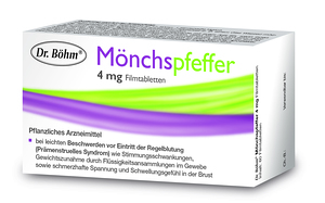 Dr. Böhm® Mönchspfeffer 4 mg FilmtablettenPflanzliche Hilfe bei prämenstruellem Syndrom (PMS)Untersuchungen zeigen, dass rund ein Drittel der Frauen im gebärfähigen Alter unter PMS leiden. Man kennt mittlerweile über 150 verschiedene Symptome, die nach dem Einsetzen der Monatsblutung rasch wieder abklingen. Als Ursache der PMS-Beschwerden werden hormonelle Ungleichgewichte vermutet. Die „Tage vor den Tagen“ wiederholen sich jeden Monat erneut, wirksame aber schonende pflanzliche Hilfe ist daher gefragt. Der Mönchspfeffer (Vitex agnus-castus), auch als Keuschlamm bekannt, hat traditionell eine große Bedeutung bei der Behandlung von Frauenleiden. Die rot-schwarze Frucht des bis zu sechs Meter hohen Strauches schmeckt leicht scharf und erinnert an Pfeffer. Im Altertum wurde sie von Mönchen und Nonnen eingesetzt, um die Lust zu mindern und die Keuschheit zu bewahren. Bereits Hippokrates, der Urvater der modernen Medizin, empfahl die Anwendung des Mönchspfeffers bei Problemen mit der Menstruation. Dr. Böhm Mönchspfeffer lindert sowohl körperliche als auch seelische PMS-Beschwerden (wie u.a. Spannungs- und Schwellungsgefühl in den Brüsten, Wassereinlagerungen im Gewebe und Stimmungsschwankungen). Die Wirkstoffe in den Früchten des Mönchspfeffers regulieren den Prolaktinspiegel und harmonisieren dadurch die hormonelle Dysbalance. Beschwerden vor und während der Tage werden wirkungsvoll reduziert. Die Regulation des Hormonhaushaltes geschieht allerdings nicht von heute auf morgen. Eine kurmäßige Anwendung über mehrere Zyklen ist ratsam. Anwendungsgebiete von Dr. Böhm® Mönchspfeffer 4 mg Filmtabletten: Traditionelles pflanzliches Arzneimittel zur Linderung leichter Beschwerden vor Eintritt der Regelblutung (Prämenstruelles Syndrom) wie etwa Stimmungsschwankungen, Gewichtszunahme durch Flüssigkeitsansammlungen im Gewebe sowie schmerzhafte Spannung und Schwellungsgefühl in der Brust.Zusammensetzung von Dr. Böhm® Mönchspfeffer 4 mg Filmtabletten: 1 Filmtablette enthält: 4 mg Trockenextrakt aus Mönchspfefferfrüchten, (Droge-Extrakt-Verhältnis 7-13:1), Auszugsmittel: Ethanol 60% (m/m) Frei von Hefe, Gluten und künstlichen Azofarbstoffen.Für Vegetarier geeignet. Das besondere Plus von Dr. Böhm® Mönchspfeffer 4 mg Filmtabletten: Dr. Böhm® Mönchspfeffer 4 mg enthält einen hochwertigen Trockenextrakt aus Mönchspfefferfrüchten in traditionell bewährter Dosierung und Anwendung. Die Filmtabletten haben eine harmonisierende Wirkung, die sich allmählich aufbaut. Auch für junge Mädchen (ab 12 Jahren) geeignet. Gebrauchsanweisung: Dr. Böhm® Mönchspfeffer 4 mg FilmtablettenNebenwirkungen, Wechselwirkungen und sonstige wichtige Informationen: siehe Gebrauchsinformation