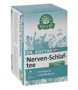 Dr. Kottas Nerven-Schlaftee* ist ein beruhigender Arzneitee mit den Wirkstoffen Baldrianwurzel und Melissenblätter. Baldrianwurzel ist entspannend und schlaffördernd, Melissenblätter wirken beruhigend. Dr. Kottas Nerven-Schlaftee ist ein traditionelles pflanzliches Arzneimittel zur Anwendung bei milden nervös bedingten Unruhezuständen, leichten Stresssymptomen und Einschlafstörungen. ART DER ANWENDUNG: Pro Tasse (125 ml) 1 Filterbeutel mit kochendem Wasser übergießen, 10 Minuten zugedeckt ziehen lassen. Danach Filterbeutel gut ausdrücken und den Tee lauwarm, schluckweise trinken. Der Tee kann nach Geschmack gesüßt werden. DOSIERUNG:Für Erwachsene und Jugendliche ab 12 Jahren: Bei milden nervös bedingten Unruhezuständen und leichten Stresssymptomen: 3 mal täglich 1 Tasse Tee Bei Einschlafstörungen: ½ Stunde vor dem Schlafengehen 1-2 Tassen Bei milden nervös bedingten Unruhezuständen und leichten Stresssymptomen: 2 mal täglich 1 Tasse Tee