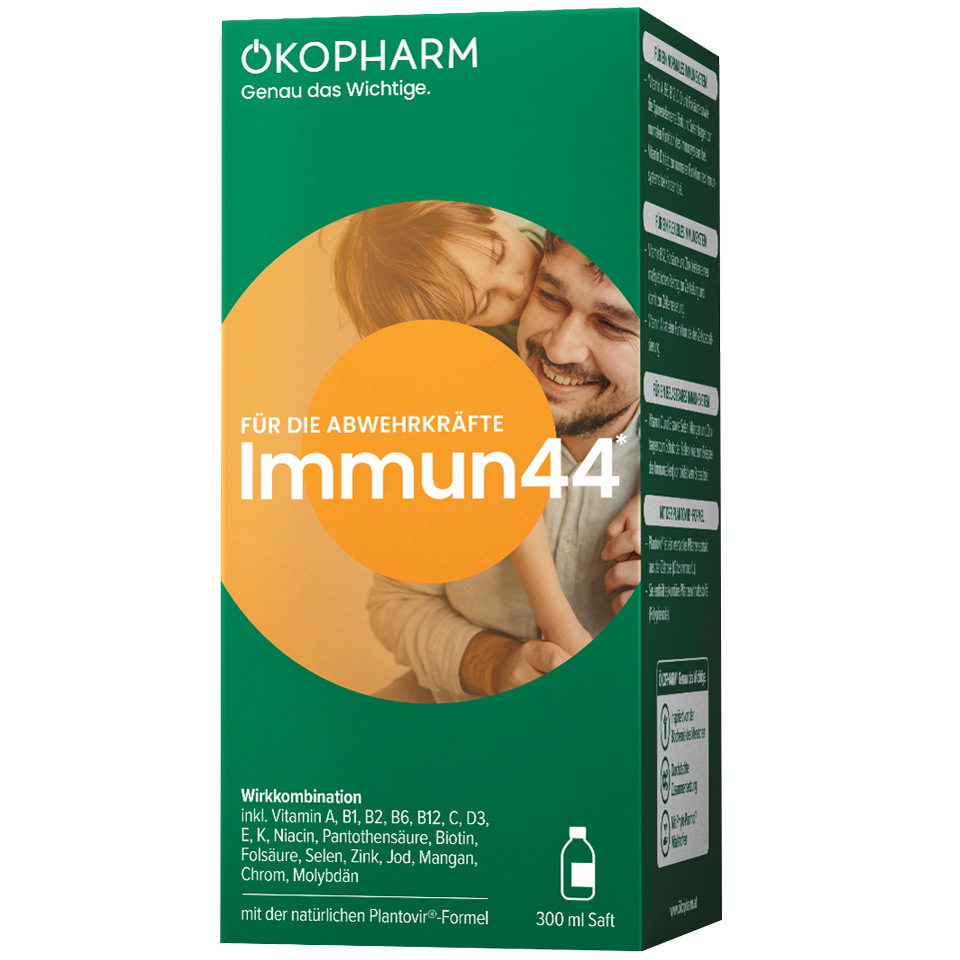 Nahrungsergänzungsmittel mit Phytoextrakten, PHYTO-PANMOL®-VITAMIN C und anderen Mikronährstoffen für ein normales Immunsystem.Immun44® Saft verhilft zu einem:normalen ImmunsystemDie Vitamine B6, Folat, B12, Vitamin A, Vitamin C sowie die Spurenelemente Selen und Zink tragen – einzeln und in ihrem biologischen Zusammenspiel – bei zu einer normalen Funktion des Immunsystems. flexiblen ImmunsystemDie Reagibilität und Flexibilität unseres Immunsystems entscheidet wesentlich über die Schnelligkeit und Effizienzunseres biologischen Abwehrverhaltens. Dabei spielen Zellteilung und Zellspezialisierungsvorgänge eine entscheidende Rolle. Folat, Cobalamine (Vit.B12) und Zink haben regulatorische Funktionen bei diesen Zellteilungsvorgängen, Vitamin A bei der Zellspezialisierung.belastbaren ImmunsystemWie alle anderen Organe und Systeme unseres Körpers ist auch unser Immunsystem angewiesen auf eine bedarfsadäquate Energieversorgung und auf ein möglichst lückenloses Schutzschild gegen sogenannten oxidativen Stress. Riboflavin (Vit.B2), Vitamin E und pflanzliche Polyphenole (aus Cistus), natürliches Vitamin C, die Spurenelemente Selen, Mangan und Zink tragen dazu bei, die Körperzellen in komplexer Weise vor oxidativem Stress zu schützen. Vitamin C trägt dazu bei, „verbrauchtes“ Vitamin E wieder zu regenerieren.Mit PHYTO-PANMOL®Immun44® Saft enthält PYHTO-PANMOL®-VITAMIN C, einen standardisierten Extrakt aus hochwertigen Acerola-Früchten. Acerolakirschen (Malpighia glabra) stammen ursprünglich aus Zentralamerika und gelten als besonders reich an natürlichem Vitamin C.Verzehrempfehlung: Zur generellen Versorgung des Immunsystems: 1 x täglich ½ Messbecher (= ca. 10 ml)Zur Versorgung des Immunsystems bei immunologischen Belastungen: 1 x täglich 1 Messbecher (= ca. 20 ml)Hinweis: - Kinder von 4 – 7 Jahren die halbe Dosierung. - Kinder ab 3 Jahren generell maximal 5 ml täglich.Information : Immun 44 SaftNebenwirkungen, Wechselwirkungen und sonstige wichtige Informationen: siehe Gebrauchsinformation