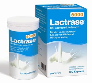 Für den unbeschwerten Genuss von Milch und Milchprodukten!In Deutschland haben ca. 15% der Erwachsenen einen Lactasemangel. Lactrase® ist ein diätetisches Lebensmittel zur besonderen Ernährung bei durch Lactasemangel bedingter Lactoseintoleranz (Milchzuckerintoleranz).Lactrase® ersetzt die bei Lactasemangel fehlende körpereigene Lactase und ermöglicht so in der Regel den beschwerdefreien Genuss von milchzuckerhaltigen Speisen und Getränken.Zutaten Lactrase® 6000 Kapseln:Füllstoff Dicalciumphosphat, Lactase (17%; 17g/100g), Gelatine**, Farbstoff E 171**Produktinformation: Lactrase 6000 KapselnNebenwirkungen, Wechselwirkungen und sonstige wichtige Informationen: siehe Gebrauchsinformation