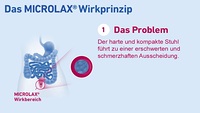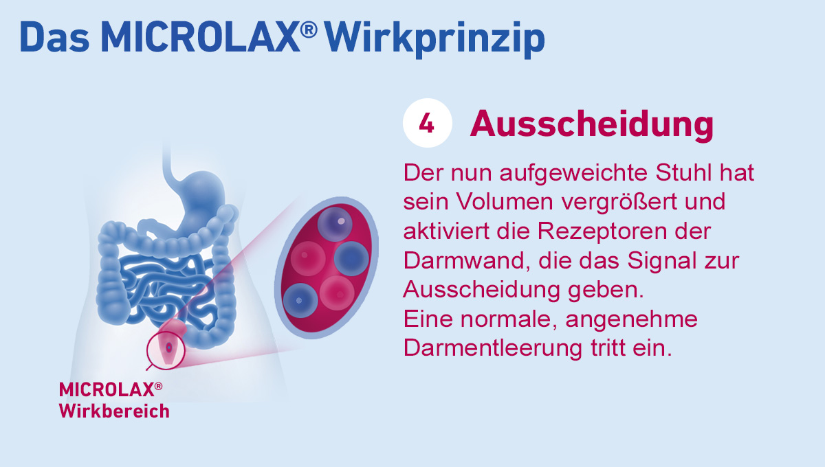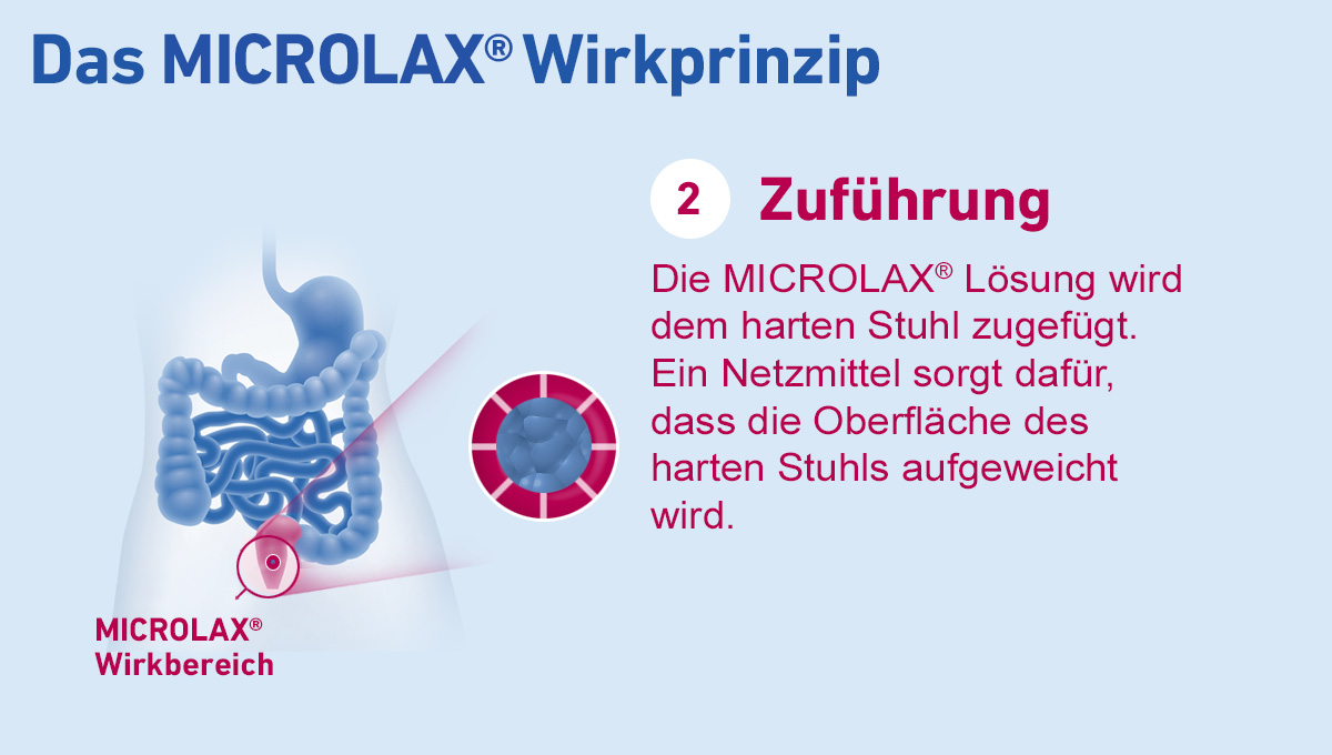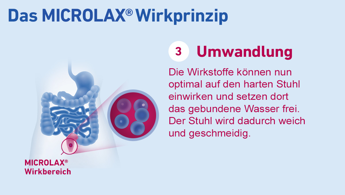 Microlax wirkt direkt auf den Stuhl und nicht auf die Darmwand, d. h. es erfolgt keine Reizung der Darmschleimhaut.