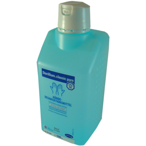 Sterillium- Lösung zur Anwendung auf der Haut. Desinfektionsmittel zum Einreiben für Hände und HautAnwendungsgebiete: Hygienische und chirurgische Händedesinfektion. Hautdesinfektion vor Injektionen und Punktionen.Dosierung, Art und Dauer der AnwendungSterillium wird unverdünnt angewendet. Zur hygienischen Händedesinfektion: mindestens 3 ml Sterillium sind auf die trockenen Hände zu geben und 30 Sekunden lang einzureiben. Nicht abspülen.Zur chirurgischen Händedesinfektion: trockene Hände und Unterarme vollständig mit Sterillium benetzen. Im Bedarfsfall wiederholen, um Hände und Unterarme während der ganzen Einreibzeit von mindestens 1,5 Minuten feucht zu halten. Nicht abspülen.Hautdesinfektion: vor Injektionen und Punktionen Sterillium 15 Sekunden lang in die trockene Haut einreiben. Vor Punktionen von Gelenken, Körperhöhlen und Hohlorganen sowie Operationen 1 Minute lang feucht halten. Talgdrüsenreiche Haut muss 10 Minuten lang feucht gehalten werden.Zusammensetzung100 g Lösung enthalten:Wirkstoffe: 2-Propanol 45,0 g, 1-Propanol 30,0 g, Mecetroniumetilsulfat 0,2 gSonstige Bestandteile: Glycerol 85 %, 1-Tetradecanol, Parfum, Farbstoff (E131), gereinigtes WasserGebrauchsinformation: Sterillium Lösung zur Anwendung auf der HautNebenwirkungen, Wechselwirkungen und sonstige wichtige Informationen: siehe Gebrauchsinformation