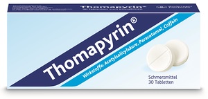 Was Thomapyrin - Tabletten enthalten– Die Wirkstoffe sind: 1 Tablette enthält 250 mg Acetylsalicylsäure, 200 mg Paracetamol und 50 mg Coffein–