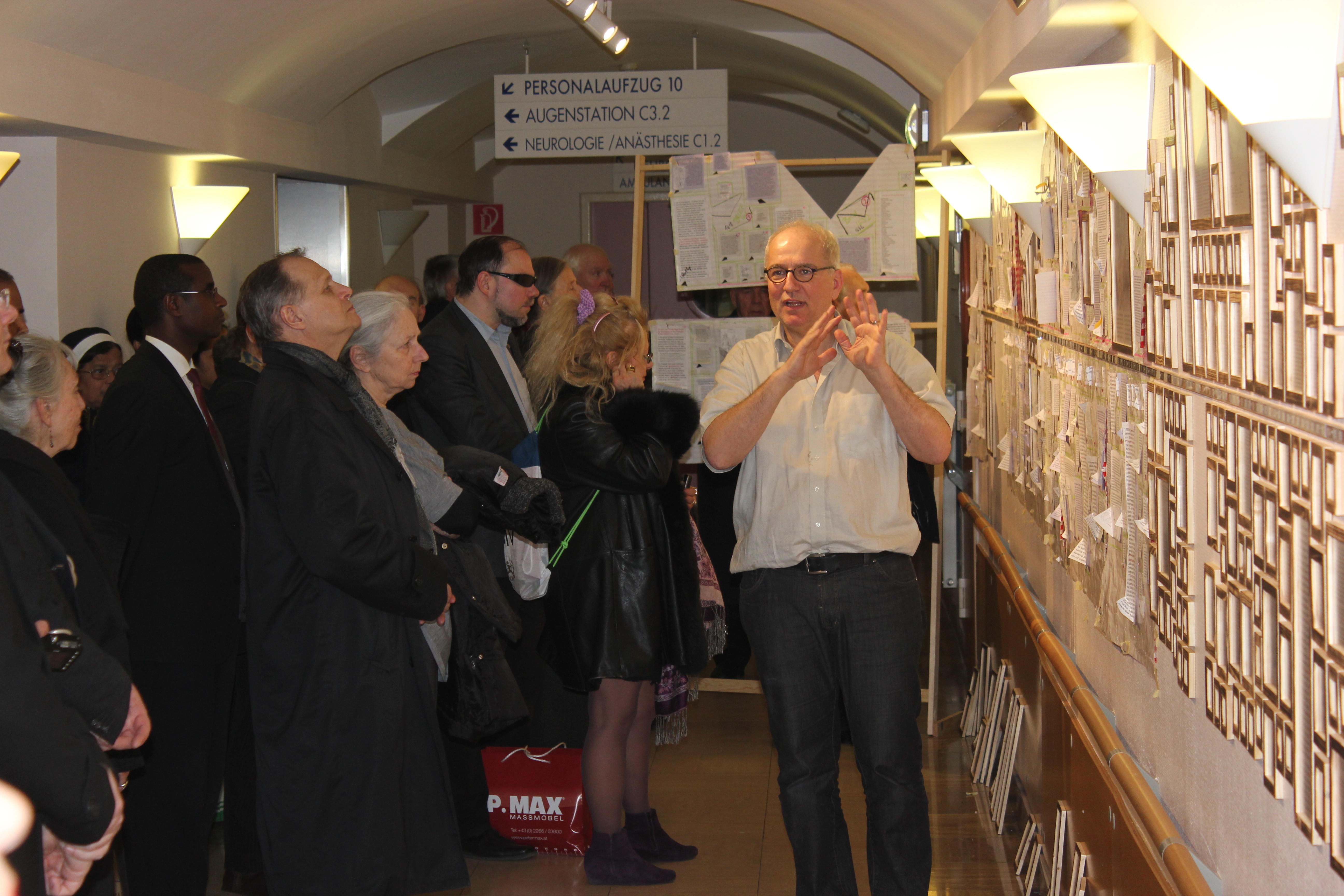 Pater Prior Paulus Kohler OH (mittig) mit Pater Provinzial Ulrich Fischer OH (rechts), jungen Brüdern sowie den Mitarbeiterinnen des Bezirksmuseums Leopoldstadt bei der Ausstellungseröffnung am 4. März 2014
