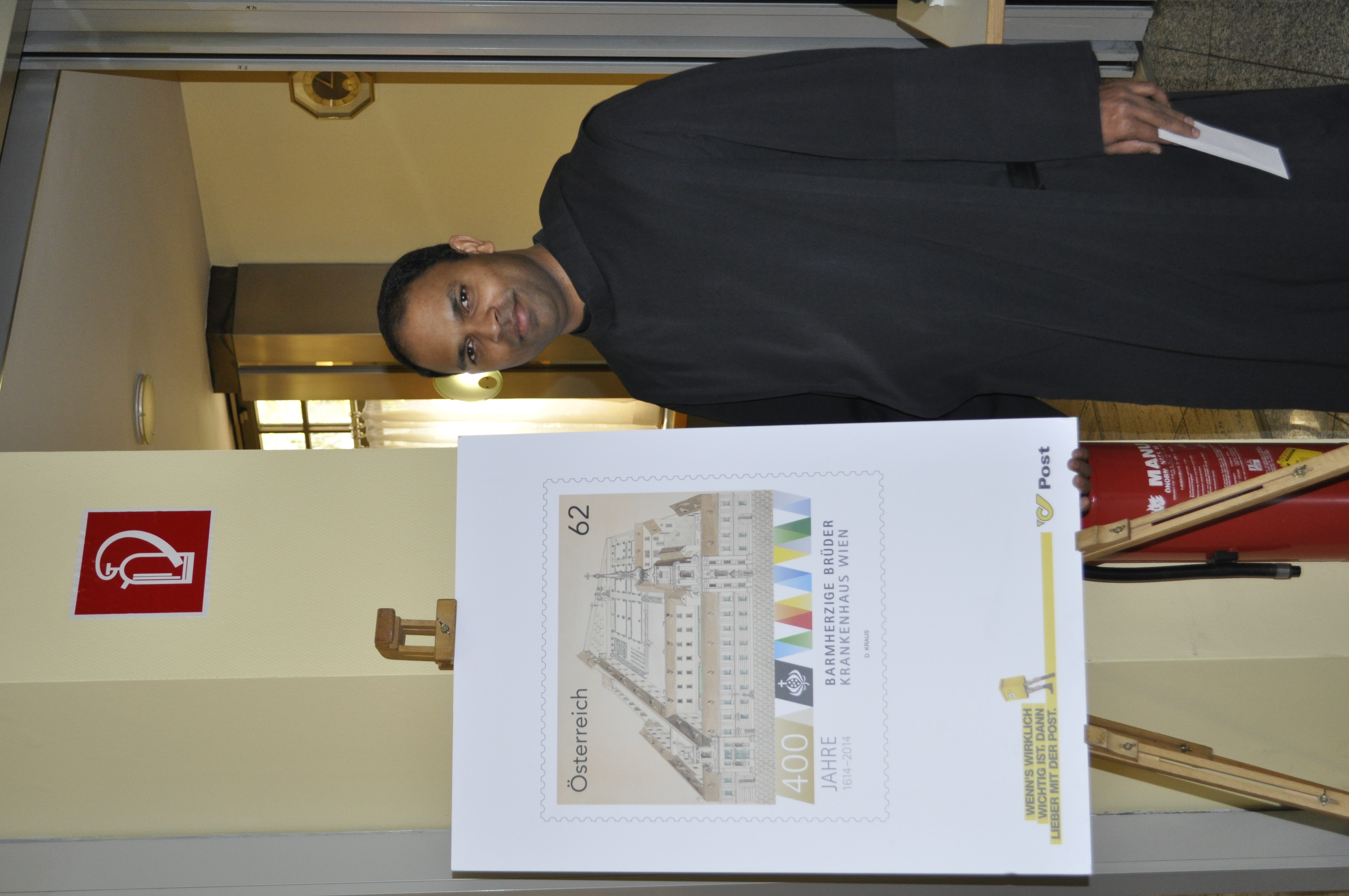 Pater Prior Saji Mullankuzhy OH mit einer Abbildung der Sonderbriefmarke, die in einem Sonderpostamt im Krankenhaus der Barmherzigen Brüder Wien am 8. März 2014 erstmals ausgegeben worden ist.