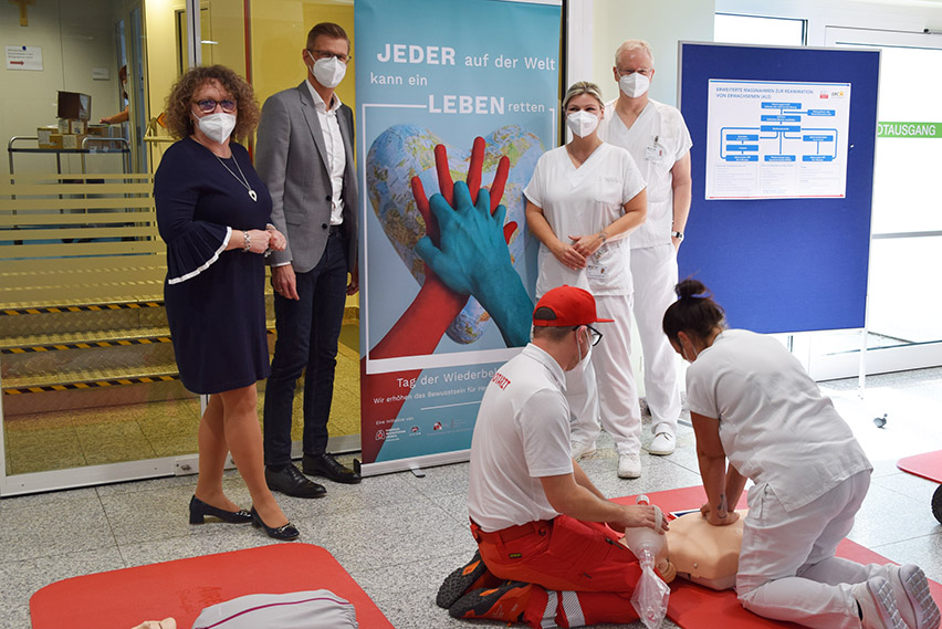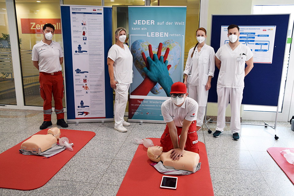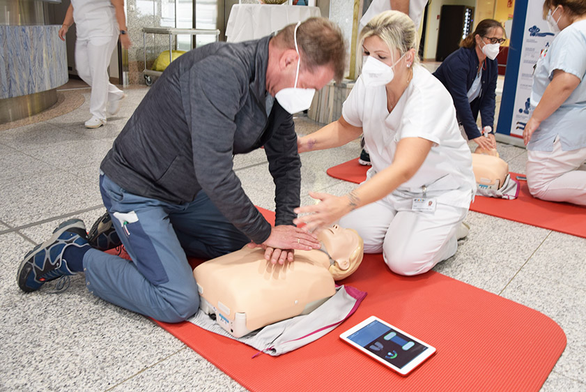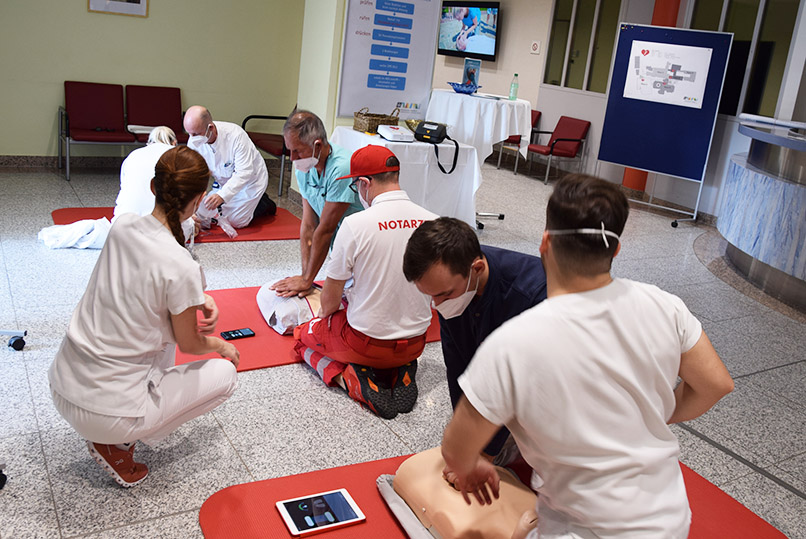 Das erfahren alle Mitarbeitenden des Krankenhauses in den regelmäßigen verpflichtenden Reanimationsschulungen. Reanimationsversorgung geht uns alle an! WARUM? Weil 60 bis 70% der Herzkreislaufstillstände im Freundes-, Verwandten- und Familienkreis auftreten. Keine Altersgruppe ist von einer möglichen Wiederbelebung ausgenommen! Unverzüglich eingeleitete Wiederbelebungsmaßnahmen verdoppeln bis verdreifachen die Überlebenswahrscheinlichkeit. Alles was man zur Hilfeleistung braucht sind zwei Hände.