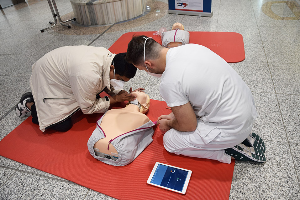 Unter Anleitung von speziell geschultem Personal wurde der Zyklus von 30 Herzdruckmassagen und 2 Beatmungen an einer Übungspuppe wiederholt.