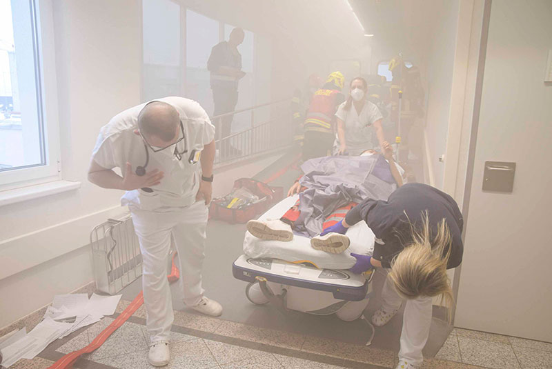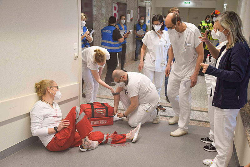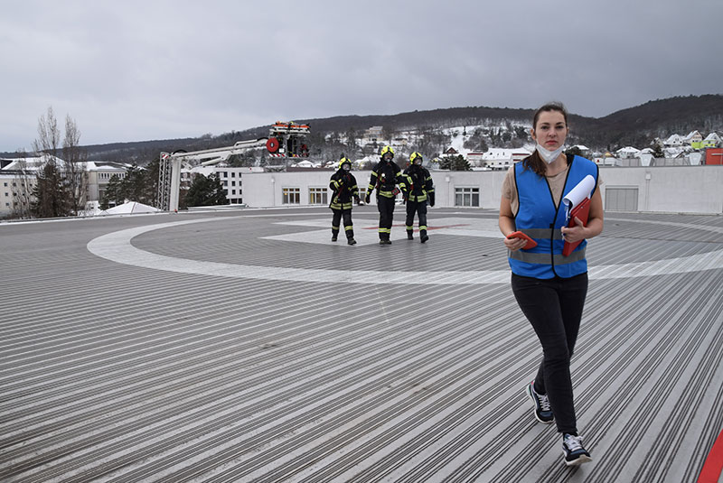 Übungsszenario war ein Hubschrauberabsturz am Landeplatz im Krankenhaus Barmherzige Brüder Eisenstadt mit sieben Schwerverletzten mit verschiedenen Verletzungsmustern.