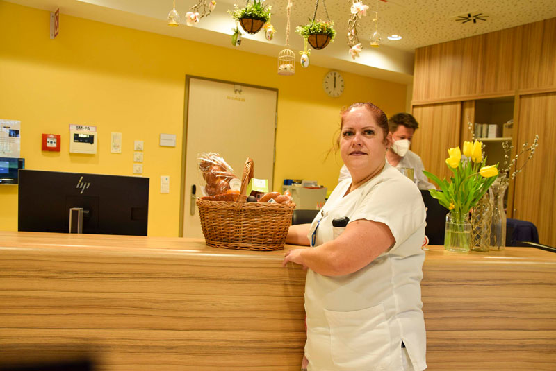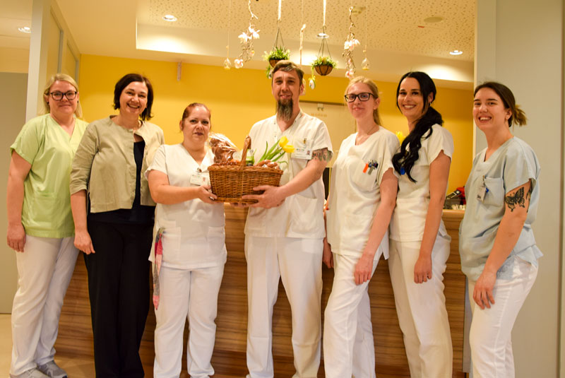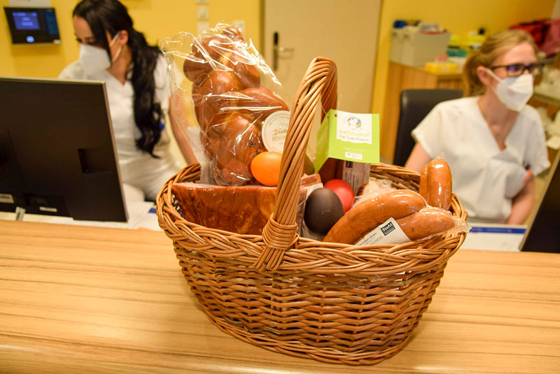 Alexandra Wimmer, Diplomierte Gesundheits- und Krankenpflegerin (DGKP), Stationsleiterin der Neurologie 1 (A3.1) überreichte am Karfreitag ihrem Team, das während der Osterfeiertage Patientinnen und Patienten auf der neurologischen Station versorgt, einen Bio-Osterkorb mit burgenländischen Köstlichkeiten von der Biogenossenschaft Burgenland.