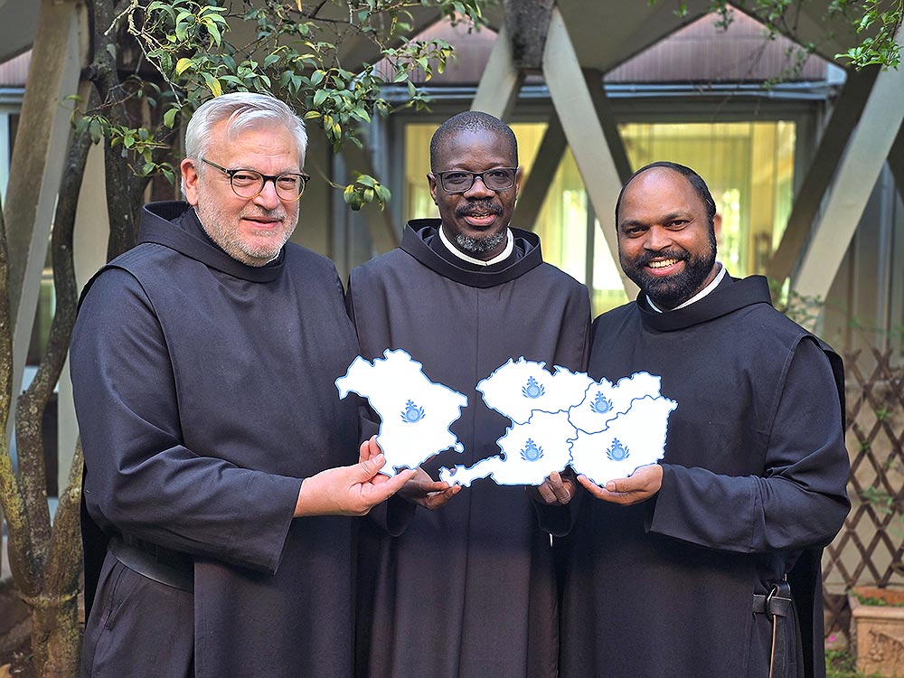 Generalprior Pascal Ahodegnon (Mitte) mit dem bayerischen Provinzial Rudolf Knopp (li.) sowie dem österreichischen Provinzial Saji Mullankuzhy mit einer symbolischen Landkarte der künftigen Provinz