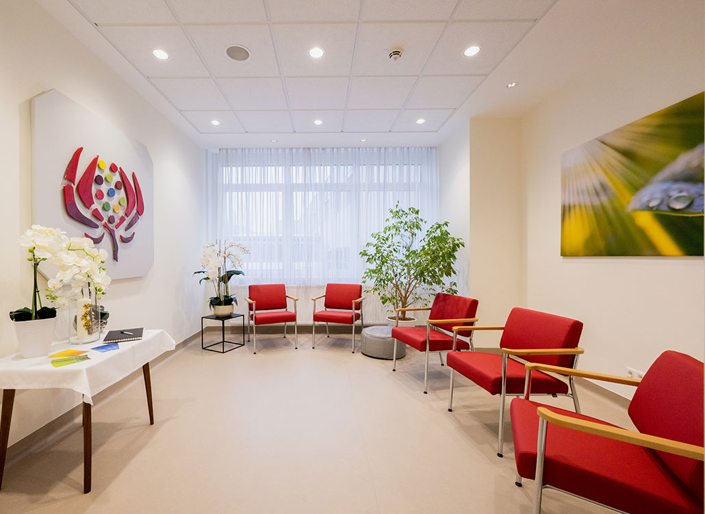 Die Ausstattung des Raumes ist in warmen Farben gehalten. An der einen Seite des Raumes hängt ein Keramik-Kunstwerk, das stilisiert einen Granatapfel darstellt. Dieses Kunstwerk wurde von Mitarbeitenden unseres Hauses erstellt. Das Bild des Granatapfels stellt eine Verbindung zum Orden und den Werten der Barmherzigen Brüder dar.