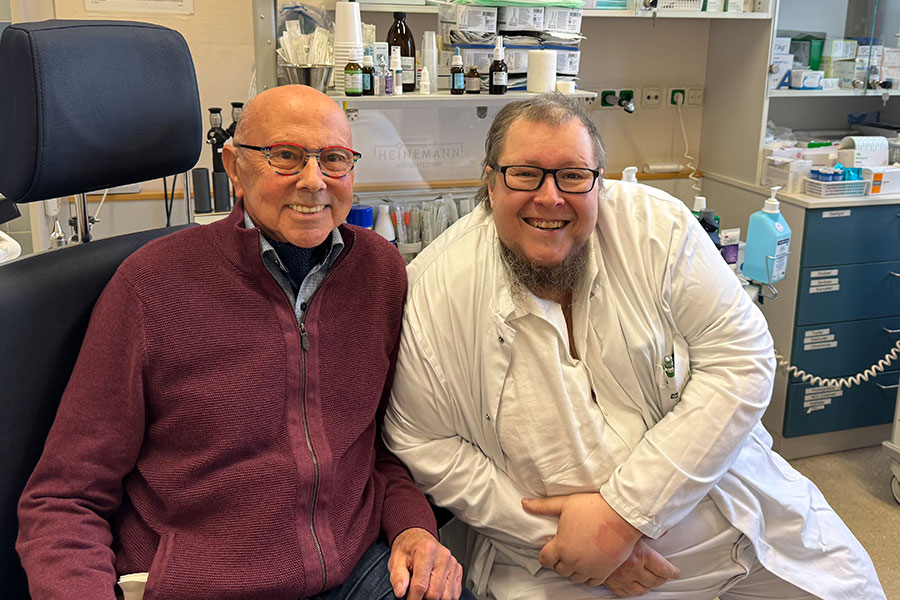 Er kennt die Sorgen und Bedenken der Patient:innen gut. „Ich habe das ganze Programm mitgemacht: zuerst Chemotherapie, dann zwei OPs, die letzte mit Entfernung des Kehlkopfs, dann zur Bestrahlung und schließlich die Reha in Deutschland. Mir kann keiner etwas vormachen.“