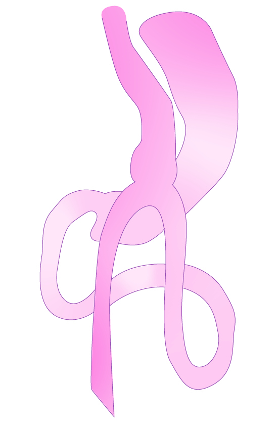 Omega Loop Magenbypass: Beim Magenbypass (sog. Umgehungsoperation) wird der bestehende Magen in zwei ungleich große Teile getrennt. Es entsteht ein neuer kleiner funktioneller Magen zur Aufnahme kleiner Nahrungsmengen und ein deutlich größerer ausgeschalteter Magen. Der funktionelle Magen wird mit dem Dünndarm verbunden, wobei die ersten 150 cm funktionell ausgeschaltet werden.