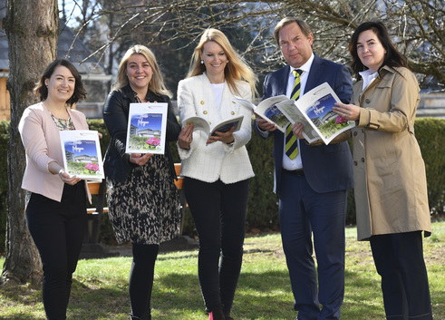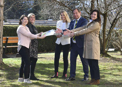 Natürlich im Grünen übergeben: Das QM-Team Ulrike Sommer, BSc. MSc. und DGKP Anna Kopeinig, BA übergaben der Kollegialen Führung mit Geschäftsführer Mag. Michael Steiner, MAS, Pflegedirektorin DGKP Silvia Lueger, MSc und der Kaufmännischen Direktorin Mag. Dr. Elke Haber, MBA den Nachhaltigkeitsbericht 2021