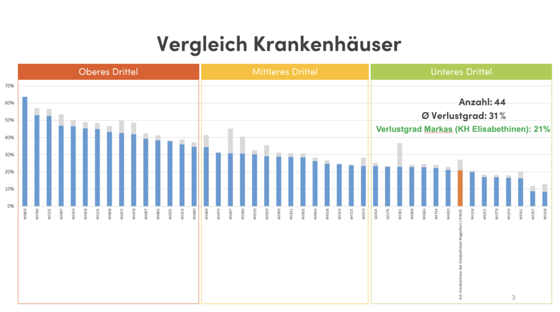 Der sogenannte Verlustgrad berechnet sich aus der Differenz zwischen ausgespeister Menge und Lebensmittelabfällen – gemeinsam konnte man einen Wert von nur 21% erreichen. Ausgewertet wurden die Abfallmengen in den Küchen von insgesamt 140 Einrichtungen, darunter Krankenhäuser, Betriebsrestaurants, Pflege- und Seniorenwohnheime sowie Reha- und Kureinrichtungen und Schulen bzw. Universitäten. Im Vergleich dazu lag der Verlustgrad in den erhobenen Krankenhäusern bei durchschnittlich 31%, somit bewegt sich die Küche im Elisabethinen-Krankenhaus mit den 21% im unteren bzw. besten Drittel aller erhobenen Kliniken.