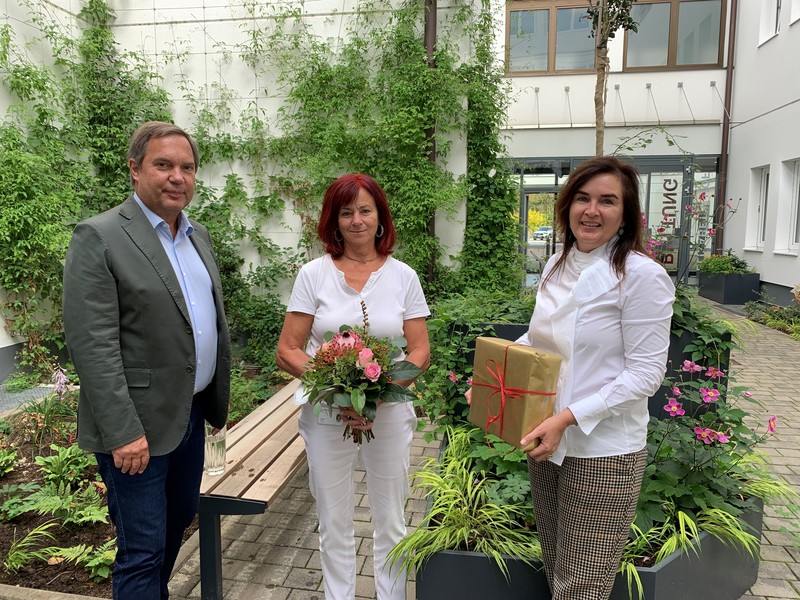 Nach über 40 Jahren verabschiedet sich Hannelore Filips in den verdienten Ruhestand. Mit Blumen dankten GF Mag. Michael Steiner, MAS und die Kaufmännische Direktorin Mag. Dr. Elke Haber, MBA Hannelore Filips für ihren jahrzehntelangen Einsatz und die Treue zum Haus