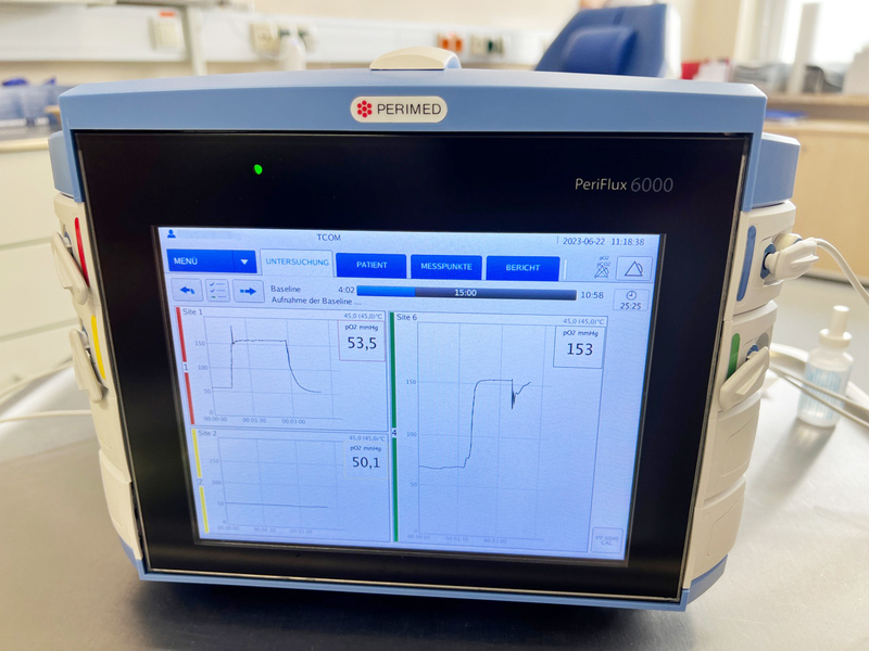 Im Rahmen der schmerzfreien Untersuchung werden dem/der PatientIn Sensoren auf die Haut geklebt. Diese messen die transkutane Sauerstoffsättigung bzw. die Durchblutungsqualitiät der Wundumgebung. Der Leiter der interdisziplinären Tagesklinik des Klagenfurter Ordenskrankenhauses Chirurg und Oberarzt mag. dr. Jurij Gorjanc sagt dazu: „Das PeriFlux 6000 bietet die einmalige Möglichkeit, die Mikrozirkulation in den Gliedmaßen der PatientInnen zu bestimmen. Mit bis zu acht Sensoren liefert das Gerät präzise Daten zur Beurteilung des Wundheilungsvermögens und hilft bei der Bestimmung der Amputationshöhe (falls erforderlich). Durch seine einfache Handhabung und automatisierten Berichte ermöglicht es den WundexpertInnen im Elisabethinen-Krankenhaus Klagenfurt, schnell und präzise Diagnosen zu stellen und individuelle Therapiepläne zu erstellen.