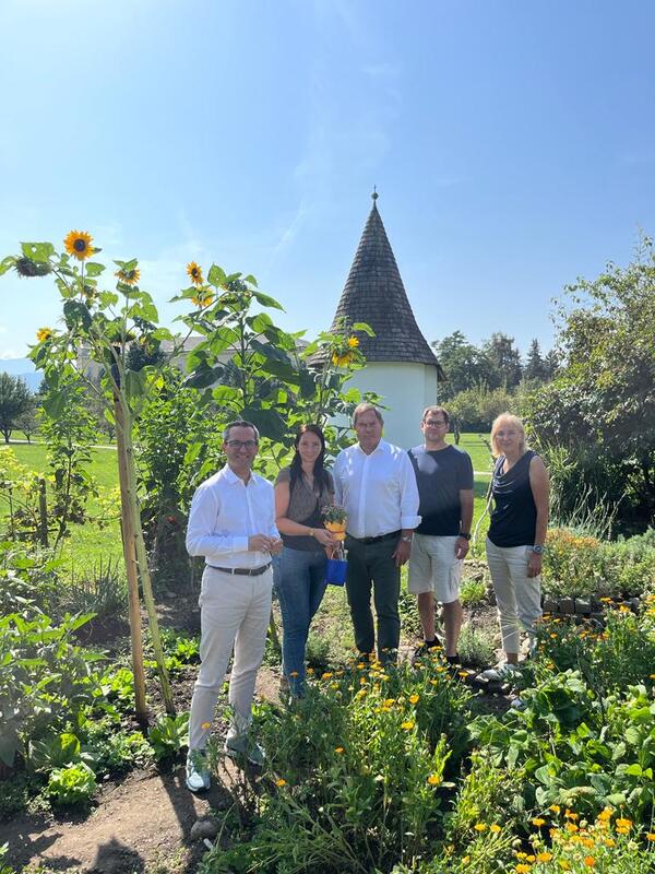 Gartenfreude: Kerstin Fanzott (Leiterin Suchtberatungsstelle), Gesundheitsstadtrat Franz Petritz, Schwester Leopoldine, Cebin Daniel (Leiter des Therapiegartens) und Dr. Birgit Trattler (Leitern Abteilung Gesundheit) luden zum Fest in den Therapiegarten.
