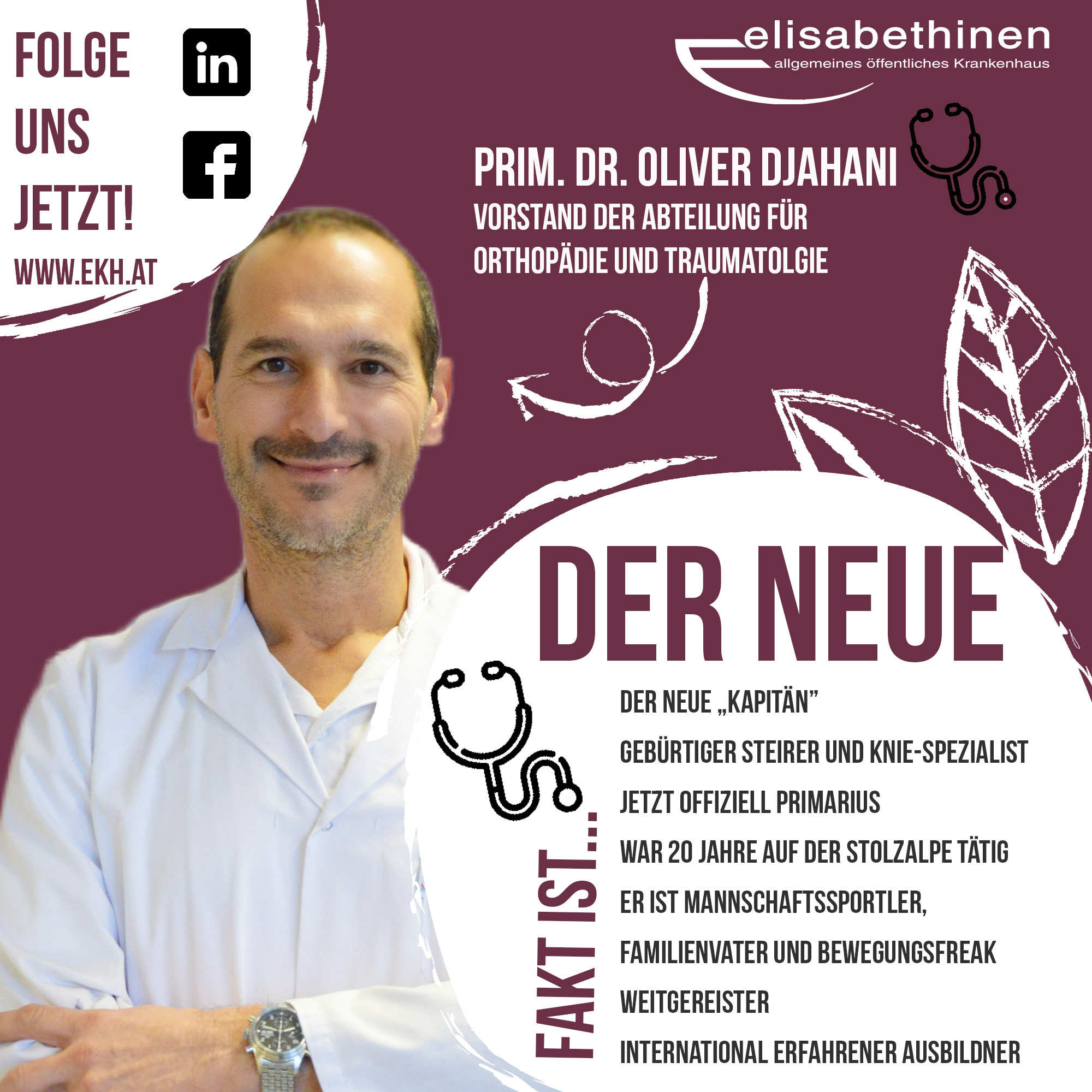 Der neue Abteilungsvorstand Prim. Dr. Djahani hat halbpersische (Vater ist Perser) Wurzeln übernimmt eine Abteilung mit 35 Betten, eine orthopädische Tagesklinik und ein Team bestehend aus zehn Fach- und OberärztInnen, drei Assistenz- und 3-4 TurnusärztInnen. „Diese internationalen Erfahrungen“ bedingt durch meine eigenen Wurzeln und die Auslandsaufenthalte, haben mich nicht nur als Chirurg, sondern auch als Mensch geprägt. Sie lehrten mich, dass Innovation, Flexibilität und das Verständnis für unterschiedliche Kulturen und Arbeitsweisen unverzichtbar für medizinischen Fortschritt sind.