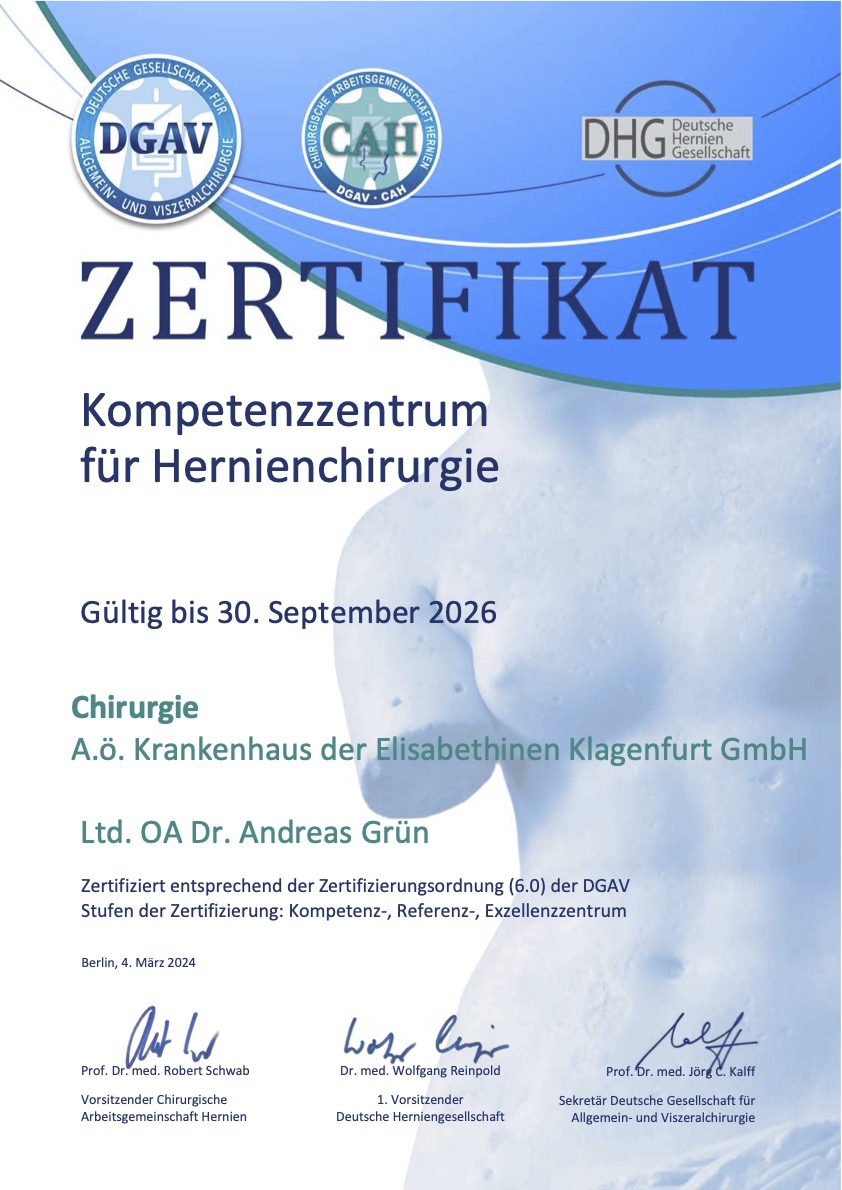 Anfang des Jahres 2024 wurde die Allgemeinchirurgie nach den strengen Richtlinien der Deutschen Gesellschaft für Allgemein- und Viszeralchirurgie (DGAV) sowie der Chirurgischen Arbeitsgemeinschaft Hernien (CAH) als eines von sieben Krankenhäusern in ganz Österreich zertifiziert und als Kompetenzzentrum für Hernienchirurgie ausgezeichnet. Dies belegt die besondere Fachkompetenz des gesamten medizinischen Teams bei der operativen Versorgung eines breiten Spektrums von Brüchen der Bauchwand, der Leiste oder des Nabels.