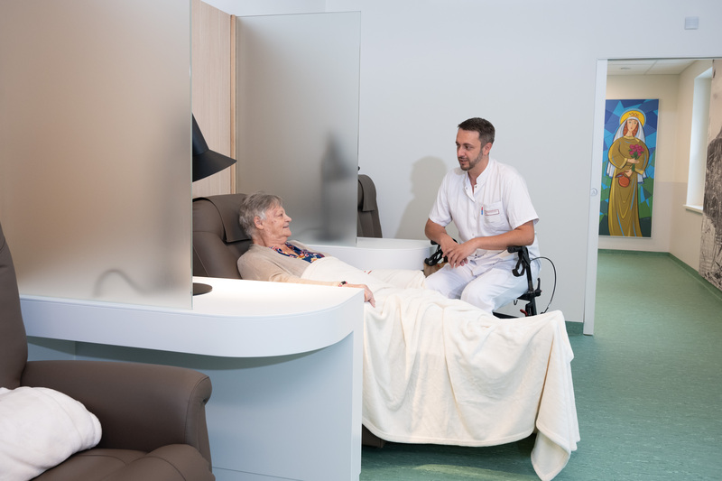 Der Ruheraum dient als Rückzugsort für Patient:innen und Besucher:innen, die nach Besinnung und Ruhe suchen. Die Präsenz des Kunstwerks von K.G. Kilian schafft eine beruhigende und harmonische Atmosphäre. Prim. Dr. Hans Jörg Neumann, Ärztlicher Leiter des Geriatrischen Tageszentrums, betont die therapeutische Wirkung der Kunst: „Kunst kann dabei helfen, Körper, Geist und Seele in Einklang zu bringen und hat damit auch positive Auswirkungen auf unsere Gesundheit. Darüber hinaus bietet sie einen wertvollen Raum für Reflexion und innere Ruhe, was für die Genesung vieler unserer Patient:innen von zentraler Bedeutung ist.“