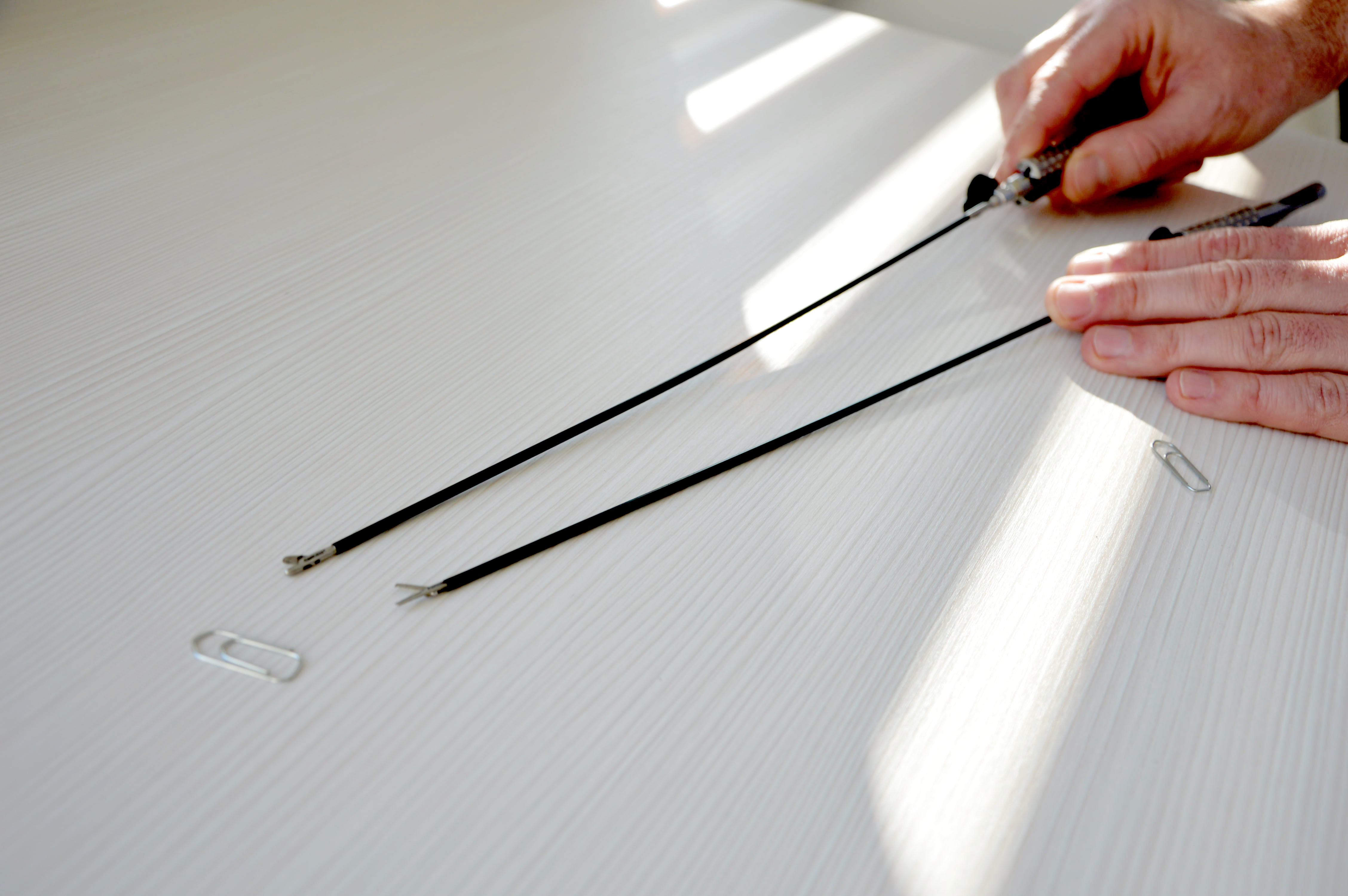 Patient Erwin Abraham wurde von Ltd. OA Dr. Andreas Grün operiert. Die OP-Geräte (oben) sind die kleinsten weltweit und sorgen für schmerz- und narbenfreie Eingriffe. Durch den minimalen Zugang von nur 2,9 mm bleiben größere Schnitte und die damit verbundenen Risiken sowie unschöne Narben am Bauch erspart – ein wichtiger Aspekt für viele Patienten wie Erwin Abraham