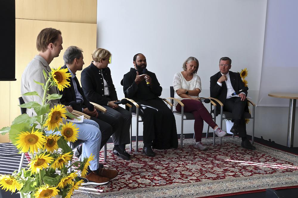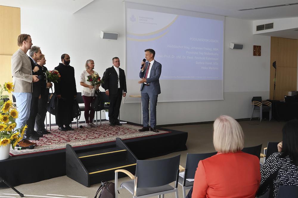 Mathias Pascottini (vorne, Moderator), Univ.-Prof. Dr. phil. Dr. theol. Reinhold Esterbauer, Heike Marterer, Provinzial Saji Mullankuzhy, Bettina Hanel, MSc, Frater Paulus Kohler, Frater Thomas Pham, Direktor Mag. Peter Ausweger, Weihbischof Mag. Johannes Freitag, MBA, Gesamtleiter Mag. Frank Prassl, MBA