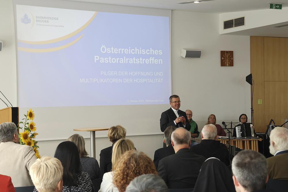 Frater Saji Mullankuzhy, Provinzial der Ordensprovinz Europa Mitte der Barmherzigen Brüder, hob die zentrale Bedeutung der Pastoral für das Selbstverständnis des Ordens hervor: „Unsere Häuser sind nicht nur Orte der professionellen Begleitung, sondern vor allem Orte, an denen Menschen Hoffnung, Glauben und Zuwendung erfahren dürfen. Pastoral bedeutet für uns, die Menschen spirituell zu begleiten und ihnen in Achtung und Respekt zu begegnen.“ Er unterstrich, dass die Haltung der Hospitalität den Alltag in allen Einrichtungen prägt: „Hospitalität ist unsere Grundhaltung. Sie trägt die Arbeit in allen Einrichtungen und macht erfahrbar, dass jeder Mensch in seiner Würde einzigartig ist.“ Provinzial Mullankuzhy verortete damit das Leitwort des Tages in der Tradition der Barmherzigen Brüder und gab zugleich eine klare Orientierung für die aktuellen Herausforderungen in Pflege, Betreuung, Bildung und Seelsorge.