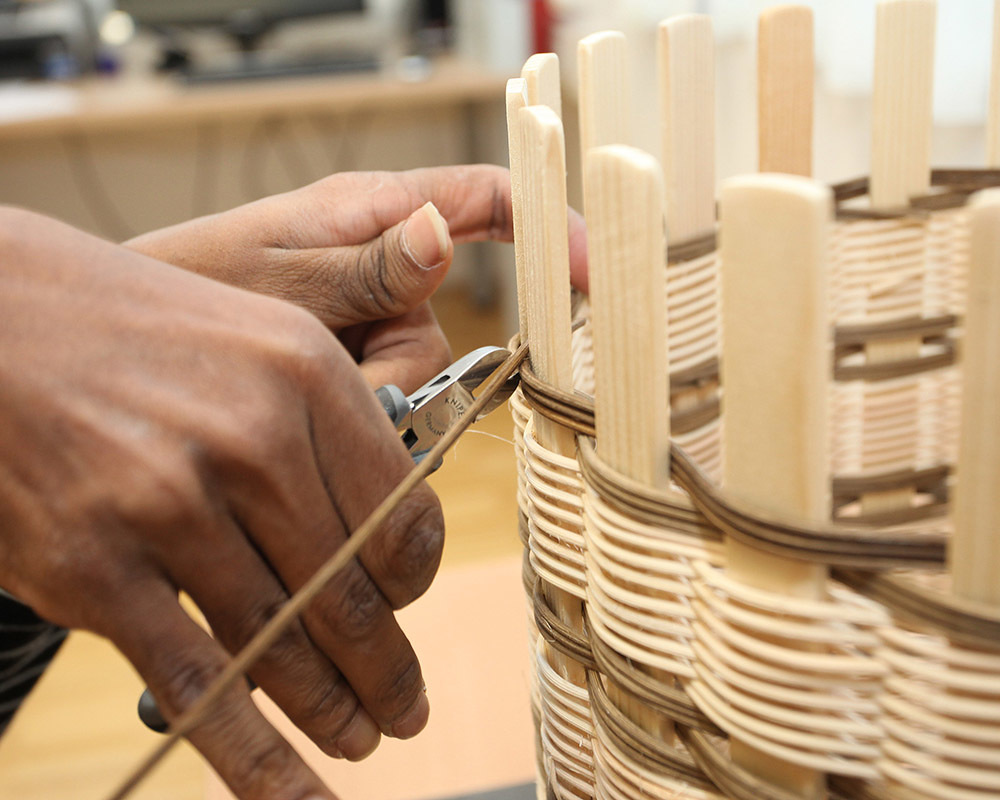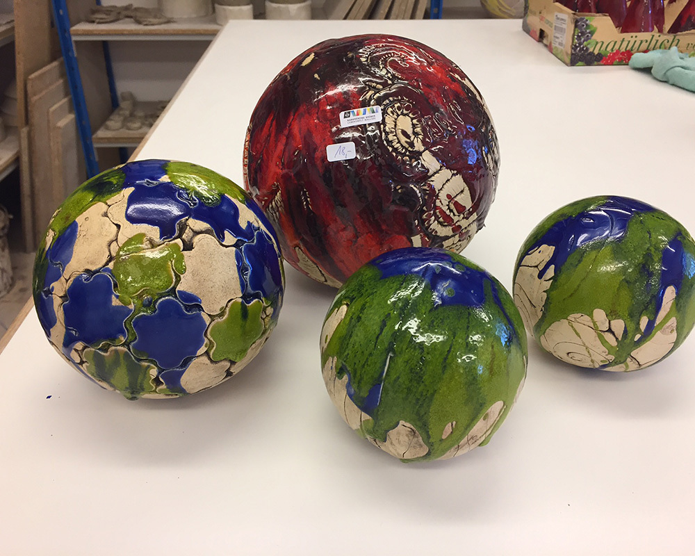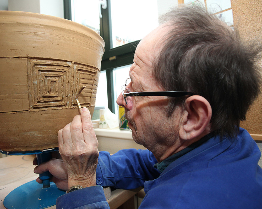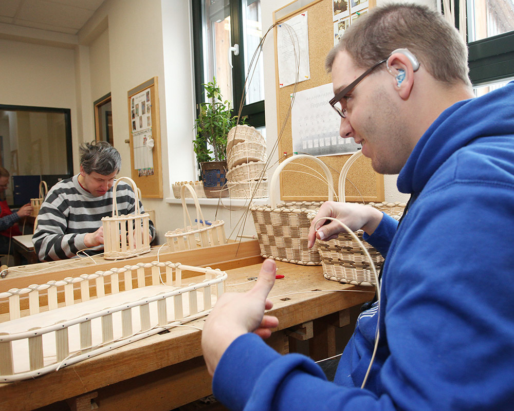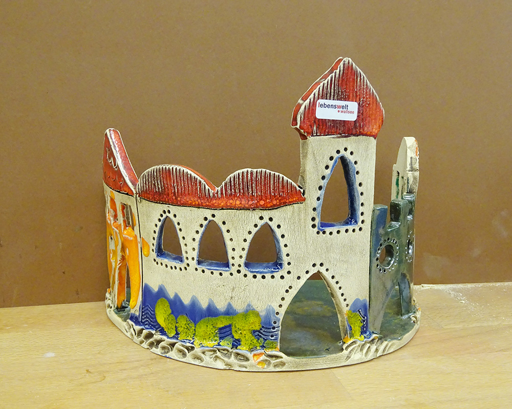 An den Lebenswelt-Standorten gibt es unterschiedliche Werkstätten, in denen mit unterschiedlichen Materialen gearbeitet wird. Zum Beispiel mit Keramik, Holz, Flechtmaterial und Textilien.