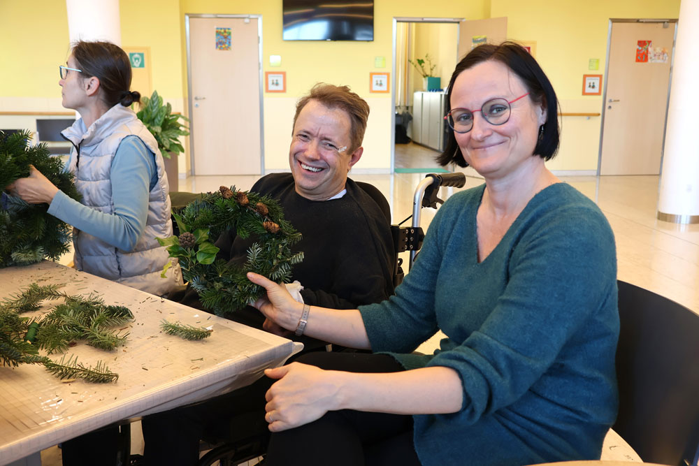Die Adventkränze für die Bereiche werden in der hauseigenen Gärtnerei gebunden.