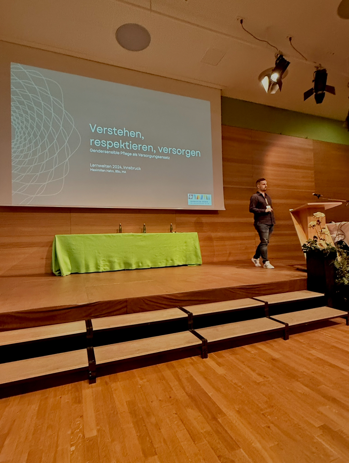 Auch die Pflegeakademie der Barmherzigen Brüder Wien spielte eine wichtige Rolle im Vortragsprogramm, insbesondere auf der großen Keynote-Bühne der Fachhochschule Gesundheit Innsbruck. Maximilian Hahn präsentierte seine Forschung zur gendersensiblen Pflege. Dabei ging er auf aktuelle Erkenntnisse und Wahrnehmungen in der Versorgung von Pflegepersonen ein und zeigte Implikationen sowohl für Gesundheitseinrichtungen als auch die Pflegepraxis auf.