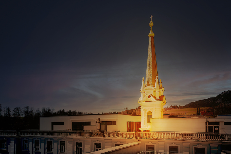 Beleuchteter Kirchturm im Krankenhaus der BB St. Veit/Glan