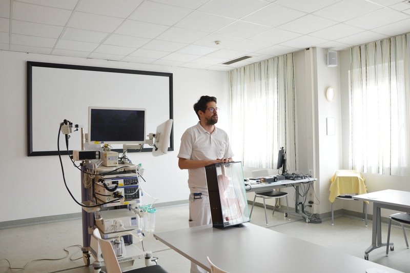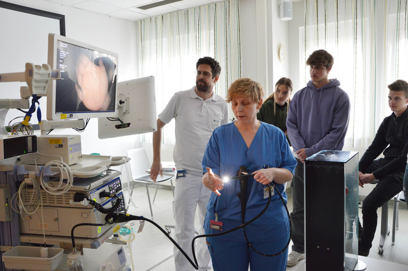Dabei tauchten die SchülerInnen in die moderne Welt der Endoskopie ein und durften auch selbst Hand anlegen. Anhand eines nachkonstruierten Magenmodells konnten sie diesen erkunden und stießen sogar auf den ein oder anderen Polypen und ein Magengeschwür.