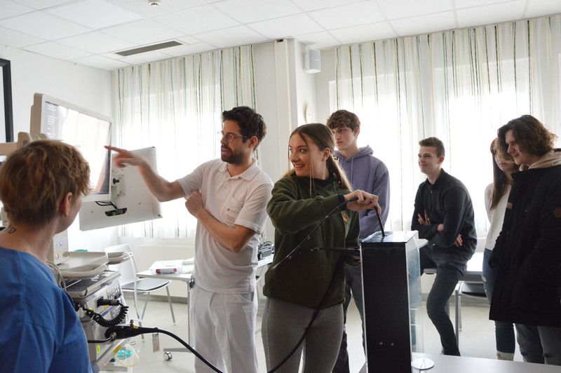 OA Dr. Fabian Hohenwarter erklärt den Schülern die Untersuchung