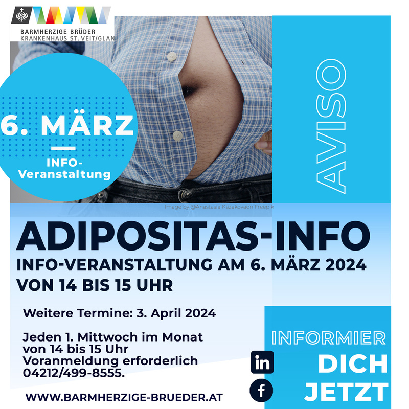 Die ExpertInnen des Adipositas-Zentrums in St. Veit informieren persönlich über das Therapiekonzept sowie die verschiedenen operativen Behandlungsmethoden. Im Anschluss haben Interessierte die Möglichkeit offene Fragen zu klären. Eine Voranmeldung ist unbedingt erforderlich, da die Interessierten bereits hier konkrete Informationen erhalten.