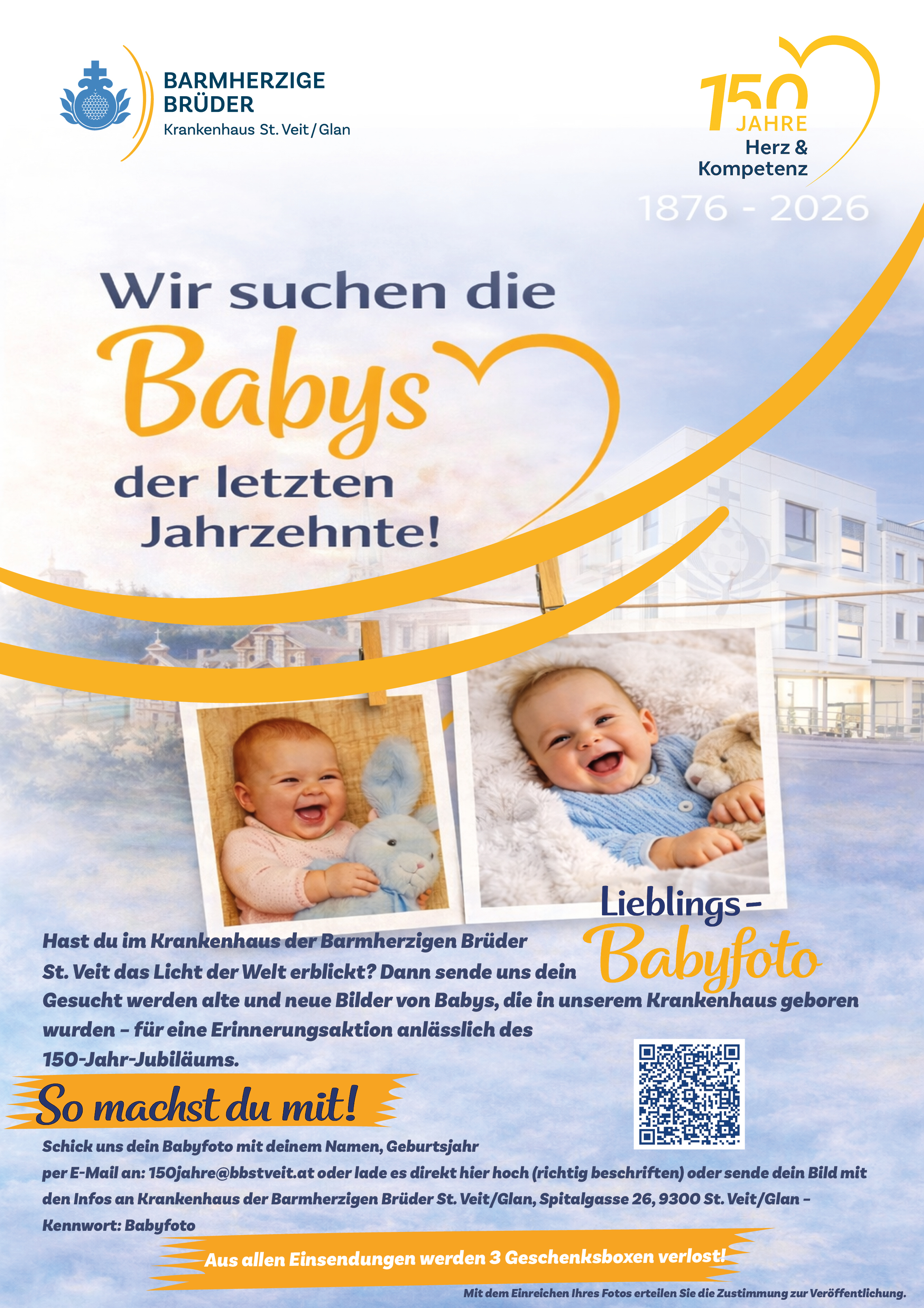 per E-Mail an: 150jahre@bbstveit.at oder lade es direkt über den QR-Code hoch oder sende dein Bild mit den Infos an Krankenhaus der Barmherzigen Brüder St. Veit/Glan, Spitalgasse 26, 9300 St. Veit/Glan – Kennwort: Babyfoto. Einsendeschluss: 31.5.