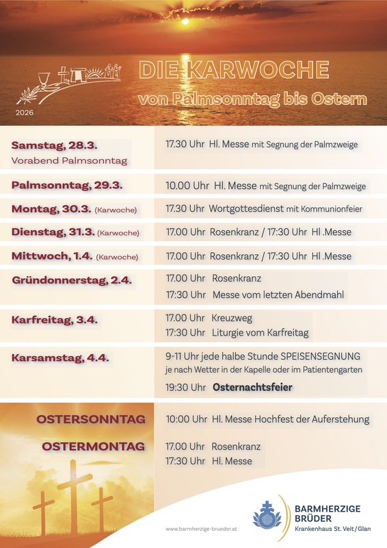Hinweis: Für die Speisensegnung im Patientengarten bitte den Zugang über die Spitalgasse nutzen, da der Zugang über die Parkgasse aufgrund einer Baustelle gesperrt ist.