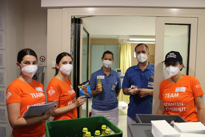 Das Team der Patientensicherheit hat sich auf eine Tour durch das Krankenhaus gemacht und alle Stationen besucht. Neben nützlichen Infos gab es für die Mitarbeitenden was zum Naschen und kühlende Getränke.