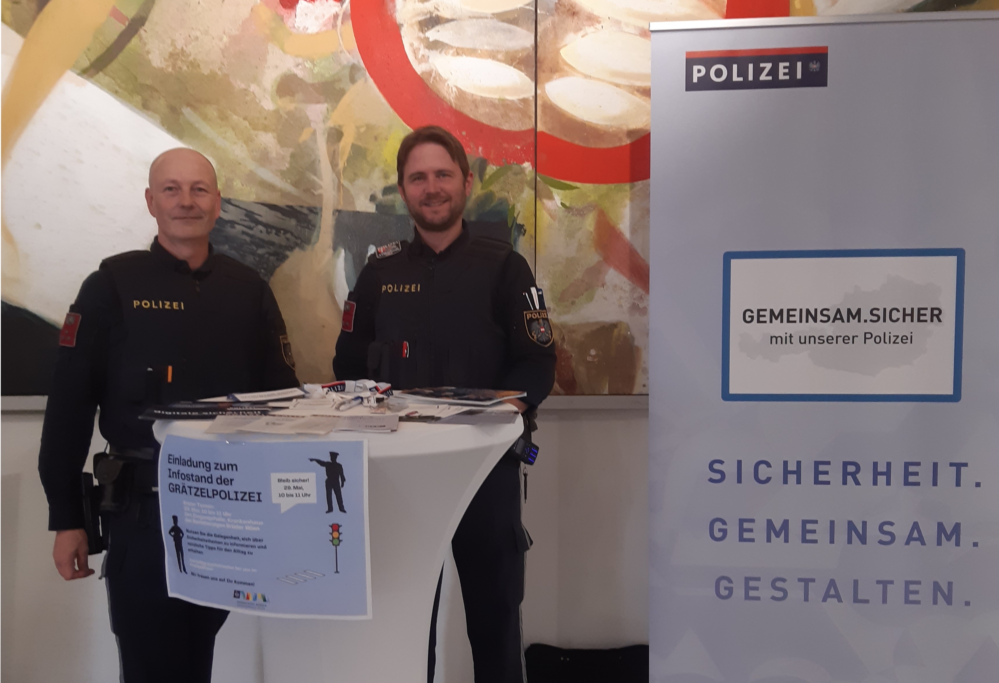 Am 29. Mai war es soweit: die Grätzelpolizei hat ihren ersten Infostand bei uns im Krankenhaus präsentiert. Das Interesse war groß, so nutzten zahlreiche Mitarbeiter*innen, Patient*innen und Besucher*innen die Gelegenheit, sich über Sicherheitsthemen zu informieren und Fragen zu stellen.