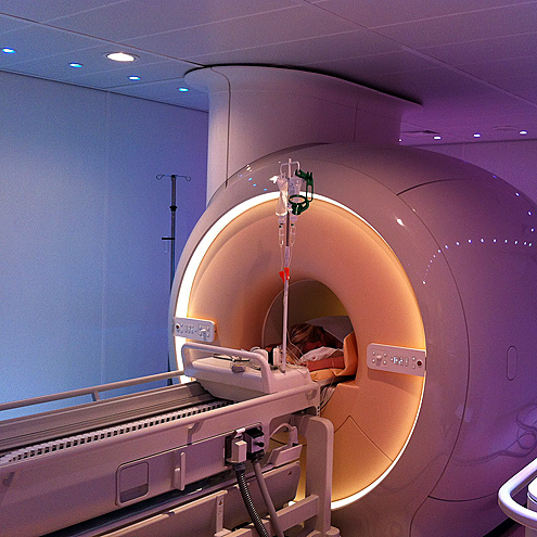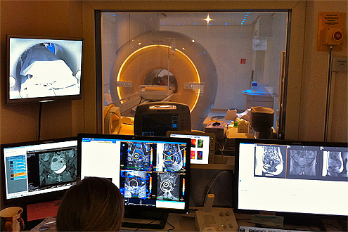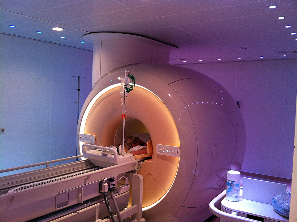 MR-Gerät mit Patientenliege, in welcher der HIFU eingebettet ist.