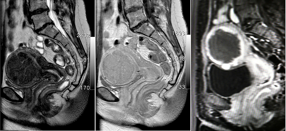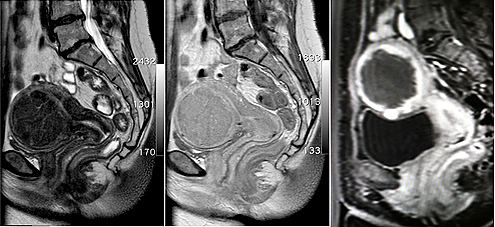 MR-Bilder vor (linkes und mittleres Bild) zeigt ein großes Gebärmuttermyom. Unmittelbar nach der MR-gesteuerten HIFU-Behandlung (rechtes Bild) ist das Myom zentral nicht mehr durchblutet (dunkel dargestellt)