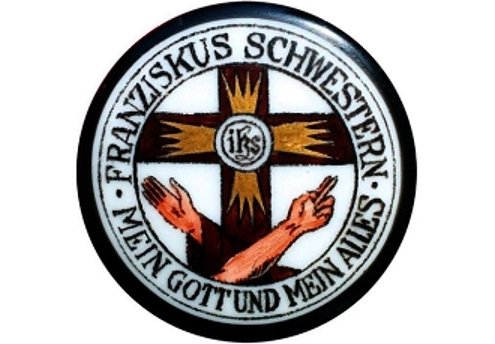 Im Mittelpunkt steht ein Kreuz, golden verstärkt und eine Hostie mit dem Jesus-Monogramm. Unter dem Kreuz befindet sich der eine Arm des gekreuzigten Jesus, auf der andere Seite ein Arm mit Kutte und unseren Ordensnamen: Franziskusschwestern – Mein Gott und mein Alles